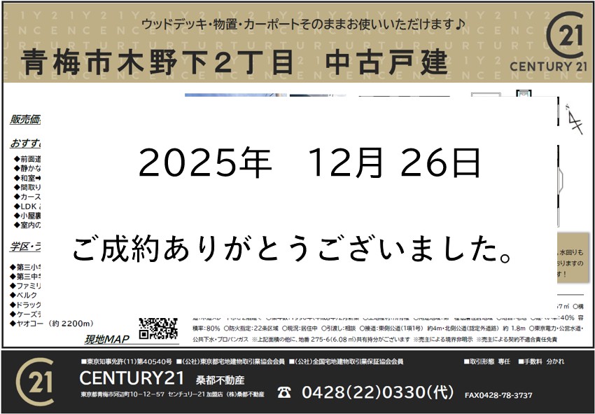 ご成約ありがとうございました お引渡しまで無事迎えられるよう誠心誠意お手伝いさせていただきます。引き続きよろしくお願いいたします。この度は本当にありがとうございました。 2025年12月27日(土)09時51分 インフォメーション