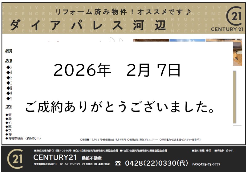 ご成約ありがとうございました お引渡しまで無事迎えられるよう誠心誠意お手伝いさせていただきます。引き続きよろしくお願いいたします。この度は本当にありがとうございました。 2026年02月07日(土)14時15分 インフォメーション
